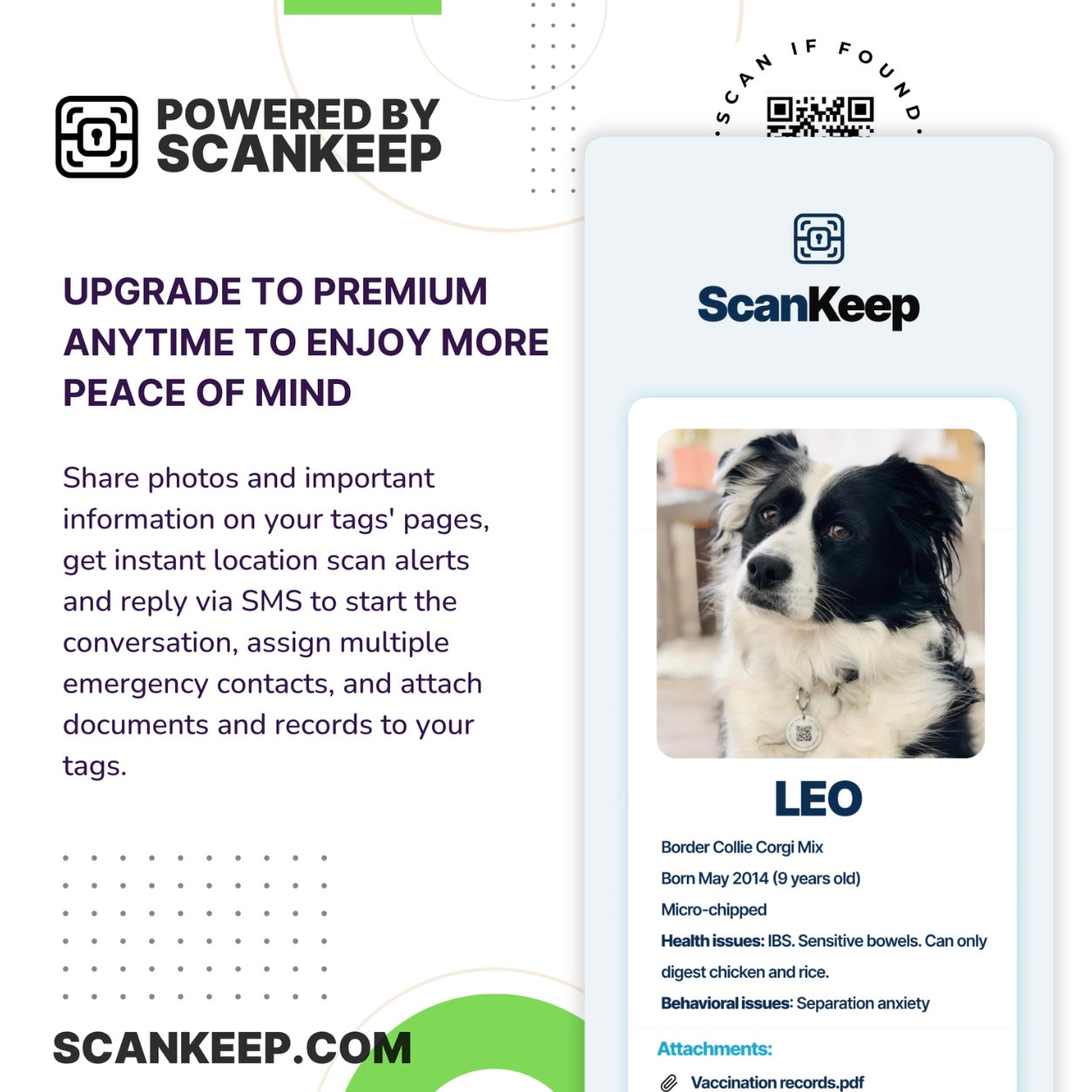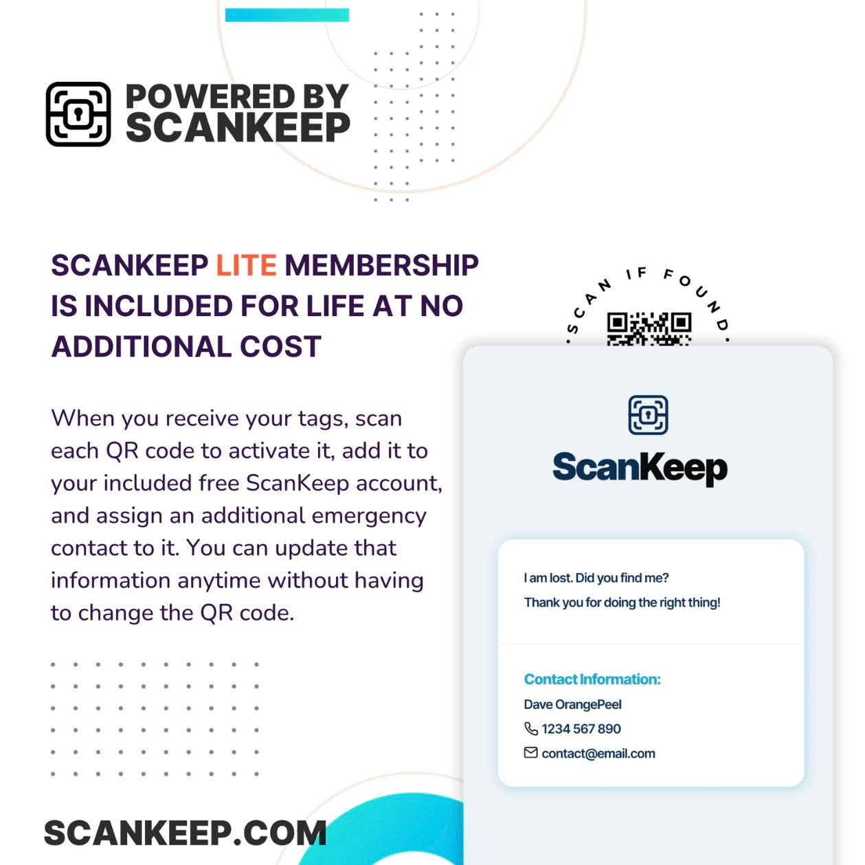 Each pet tag has a unique QR code on the reverse and includes a free lifetime membership to a profile which allows you to record your contact details. When first scanned you set up a profile with your name, number and email address, which can be amended at any time. If your pet is found, on scanning the QR code, your contact details will be available.