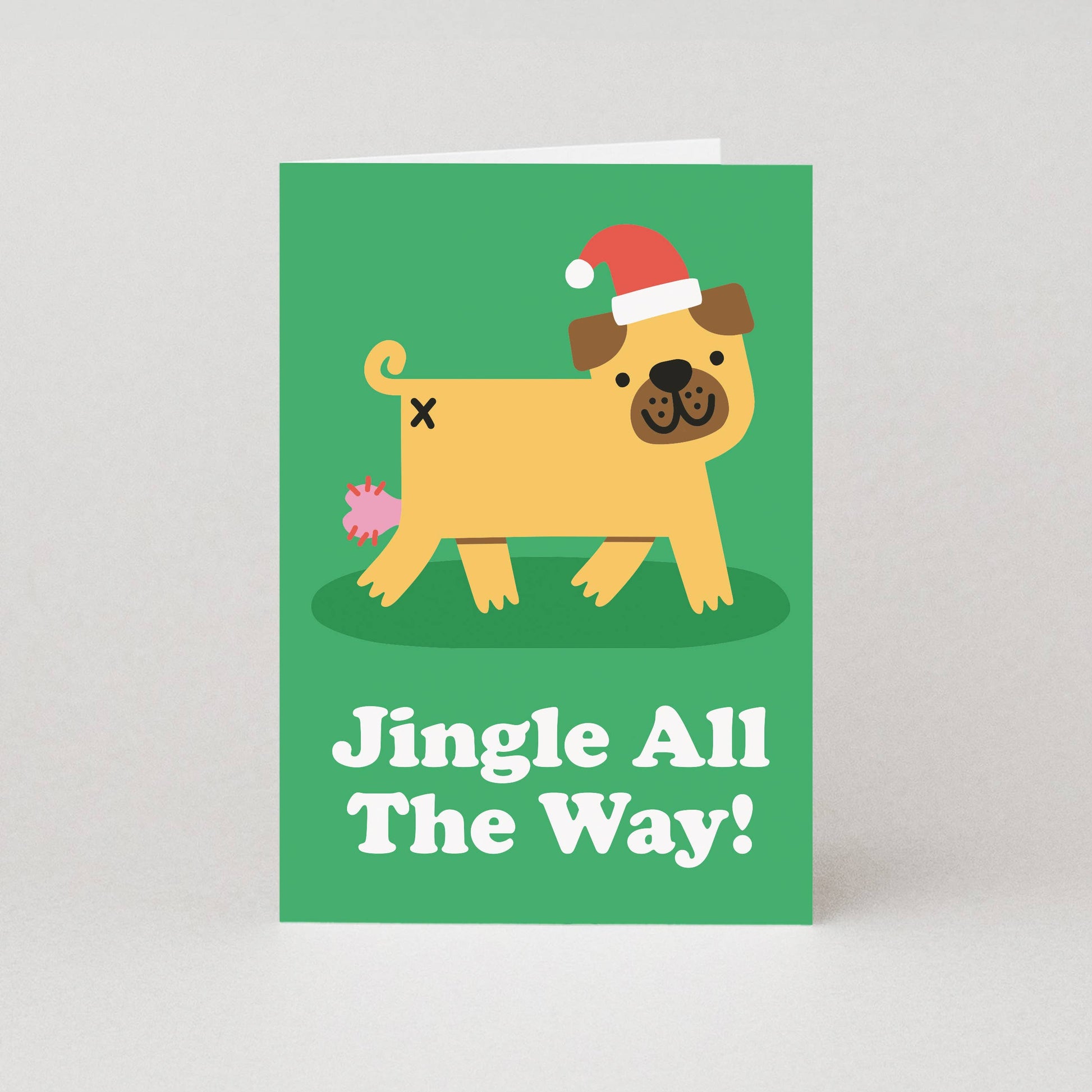 How does that Christmas carol go again? Jingle bells? No, Jingle balls? The illustrated puppy on this dog christmas card certainly knows which, strutting above the “Jingle all the way!” caption with its cheeky grin and jaunty Santa hat. This rude Christmas card is perfect for a dog lover with a cheeky sense of humour.