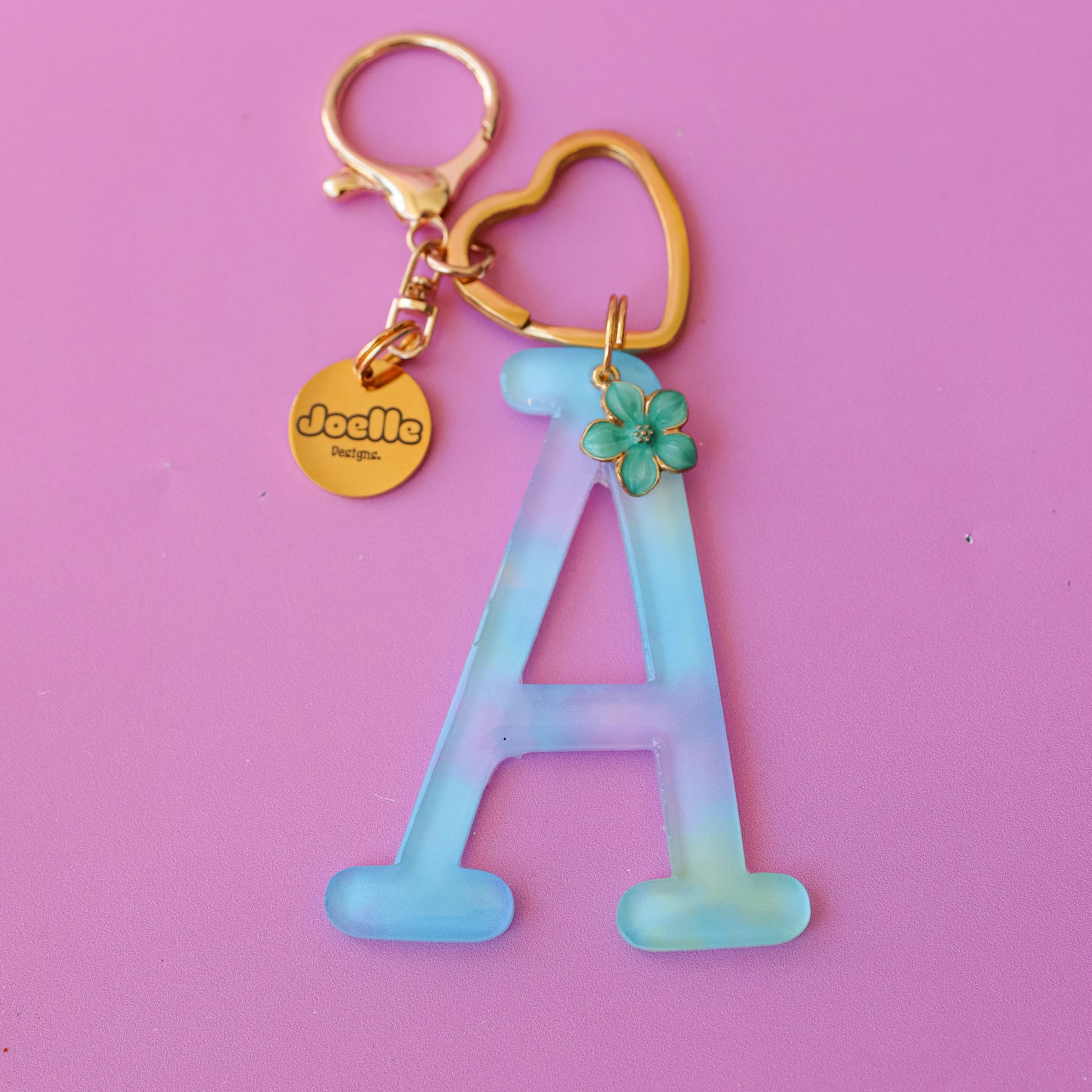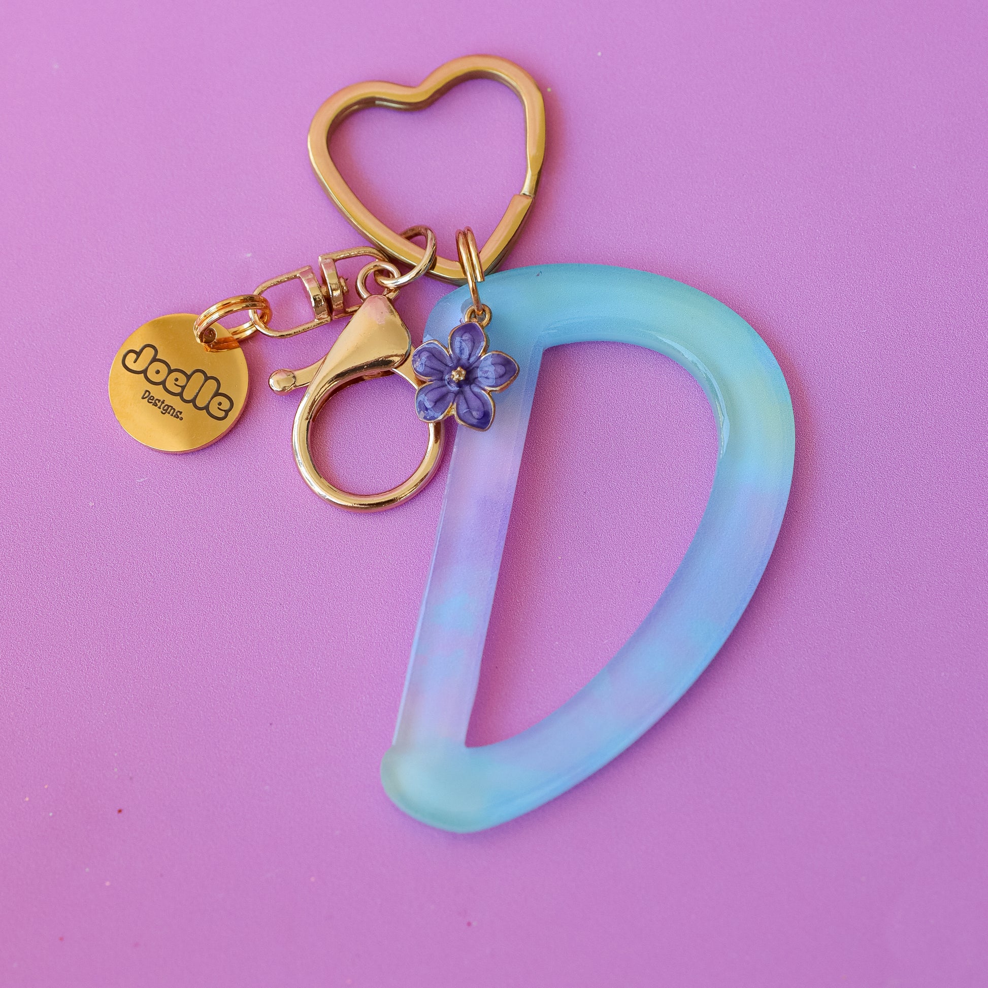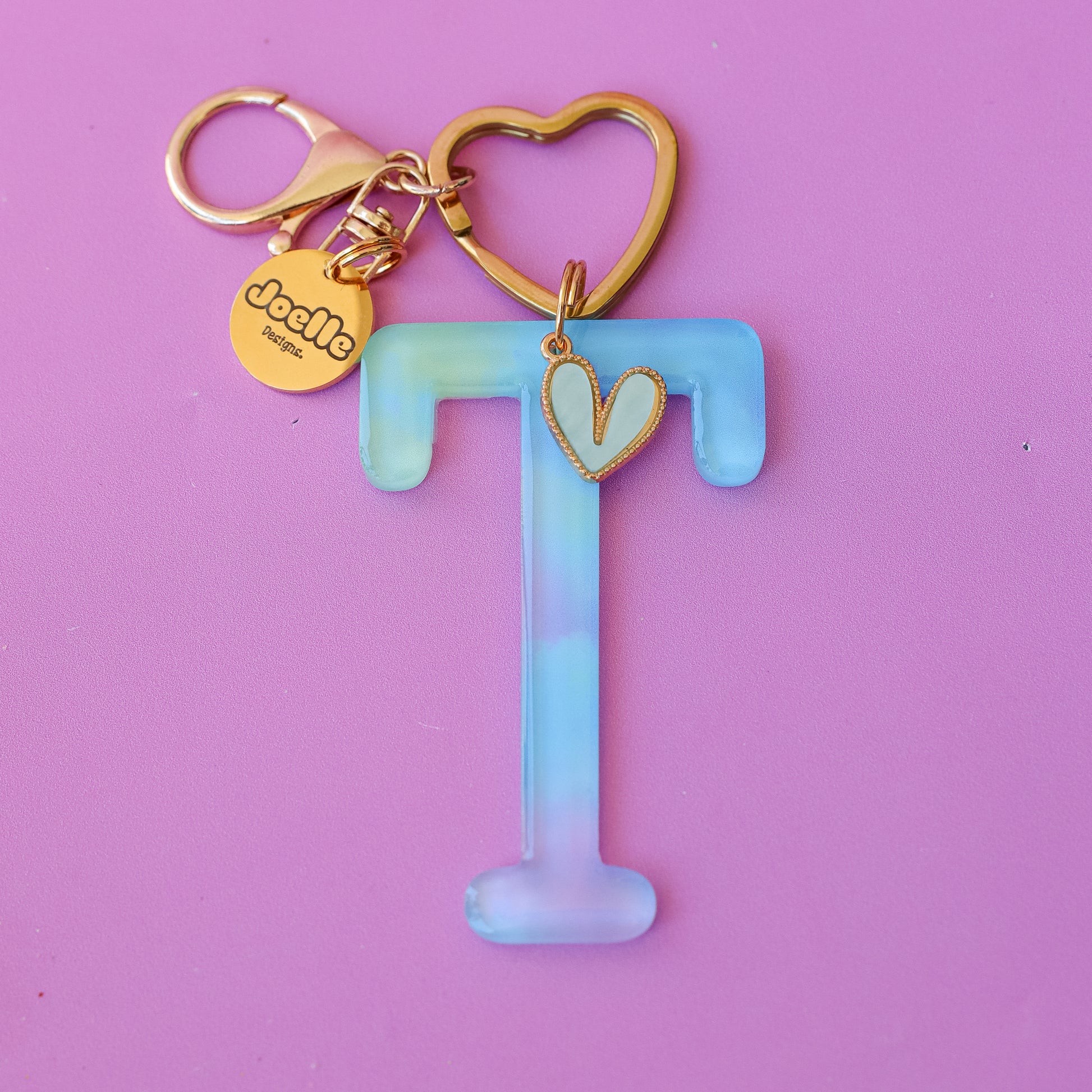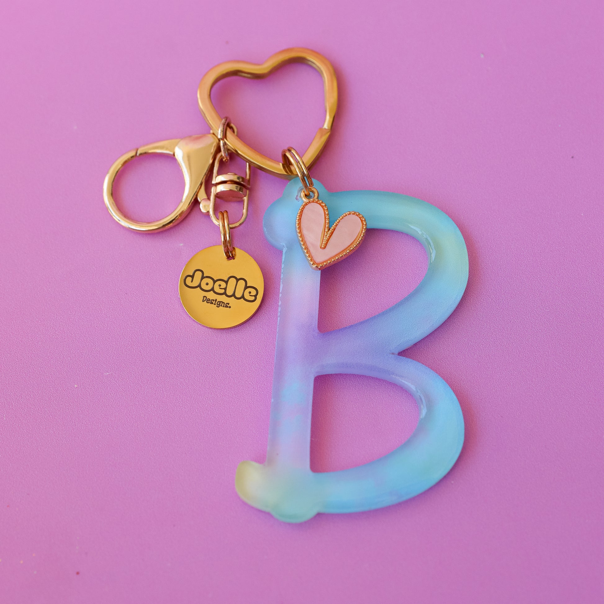 Handmade UV printed acrylic and resin letter keyring with heart shaped split ring, clasp and charms.